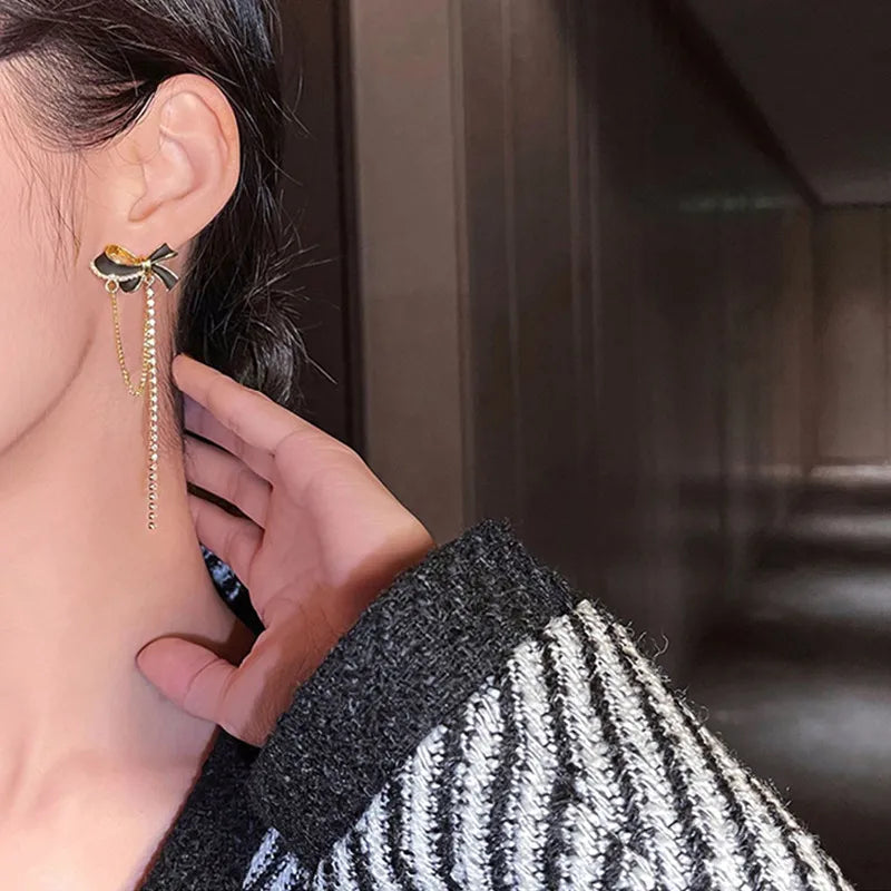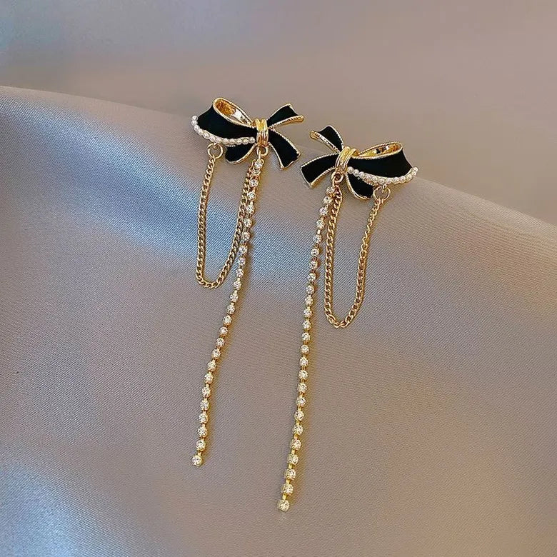 Small gold tone and black oil drip bow studs adorned with chain and rhinestone tassels. 2.25” long. Light post back.