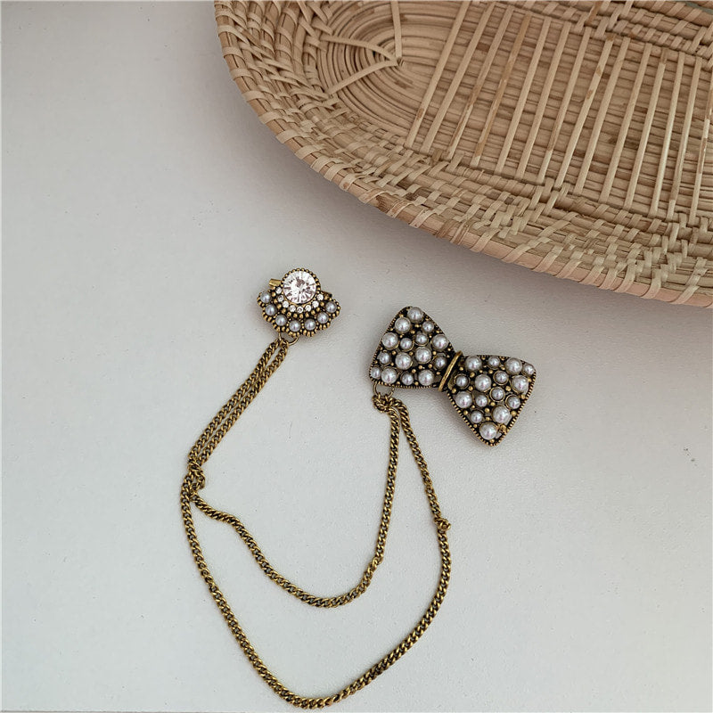 Elevate your accessory collection with this refined pearl bow brooch, inspired by timeless Chanel elegance. Delicate pearl detailing adorns the bow silhouette, while an intricate chain connects seamlessly to a lustrous pearl button closure. Perfect for layering on blazers, cardigans, or evening wear, this piece adds an understated touch of luxury to any ensemble. A versatile investment that transcends seasons and trends.