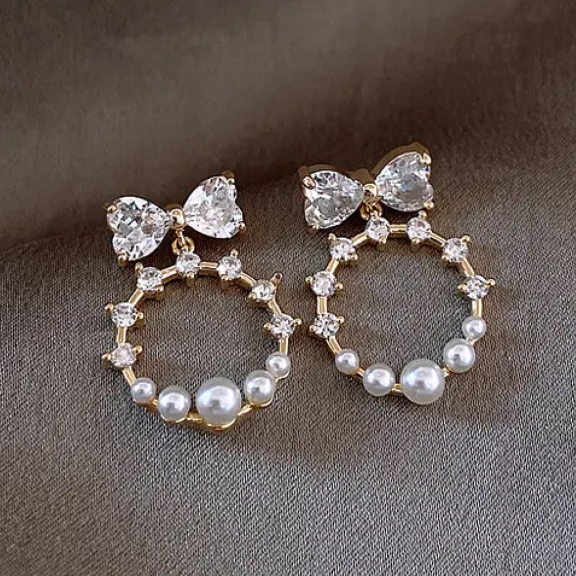 Meet your new favorite accessory! These precious dangle earrings combine lustrous pearls and sparkling rhinestones in an enchanting wreath design, crowned with an adorable bow detail. Lightweight and delicate, they're the perfect way to add a touch of glamorous whimsy to any outfit. Whether you're heading to brunch or a night out, these playful beauties catch the light beautifully and bring instant joy to your jewelry collection.