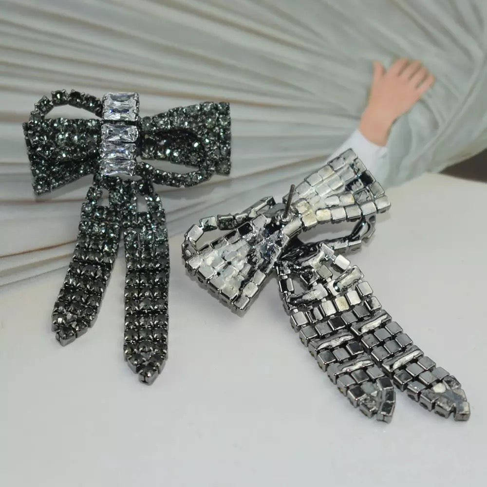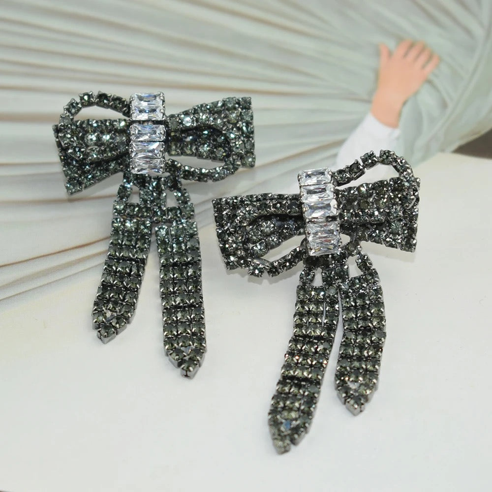 Graphite metal and crystal bow earrings. Sweet and sassy in one! 2.5” long. Light weight post back.