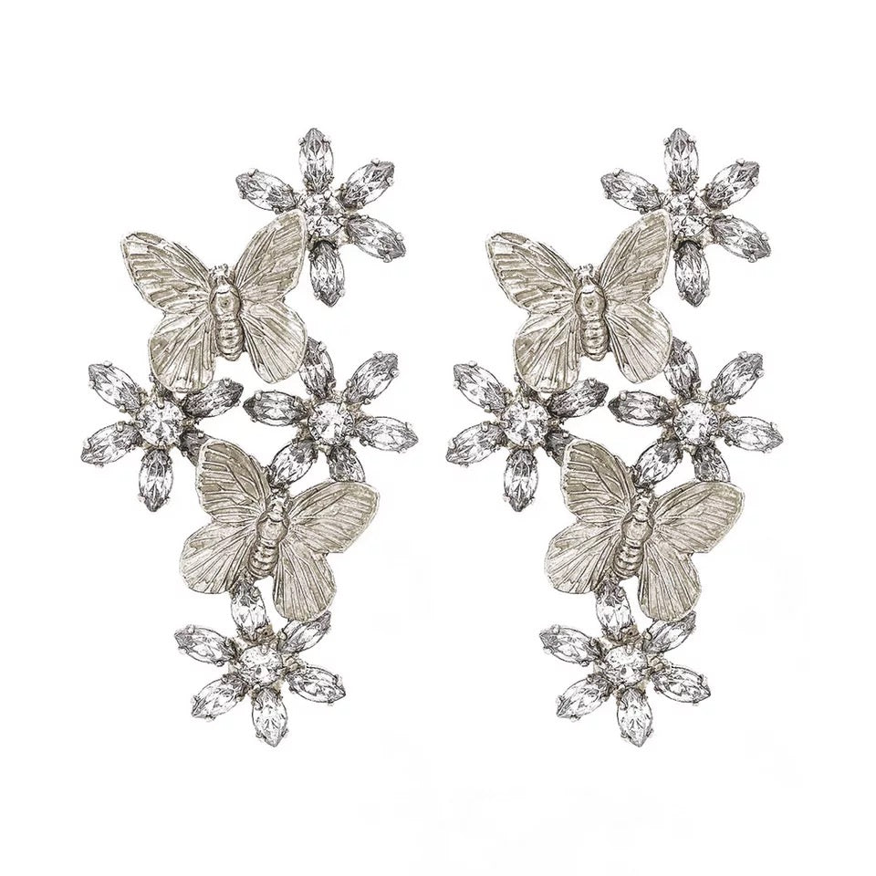 beautiful gold or silver plated drop butterfly and rhinestone earrings. 2.5” long. Light weight post back