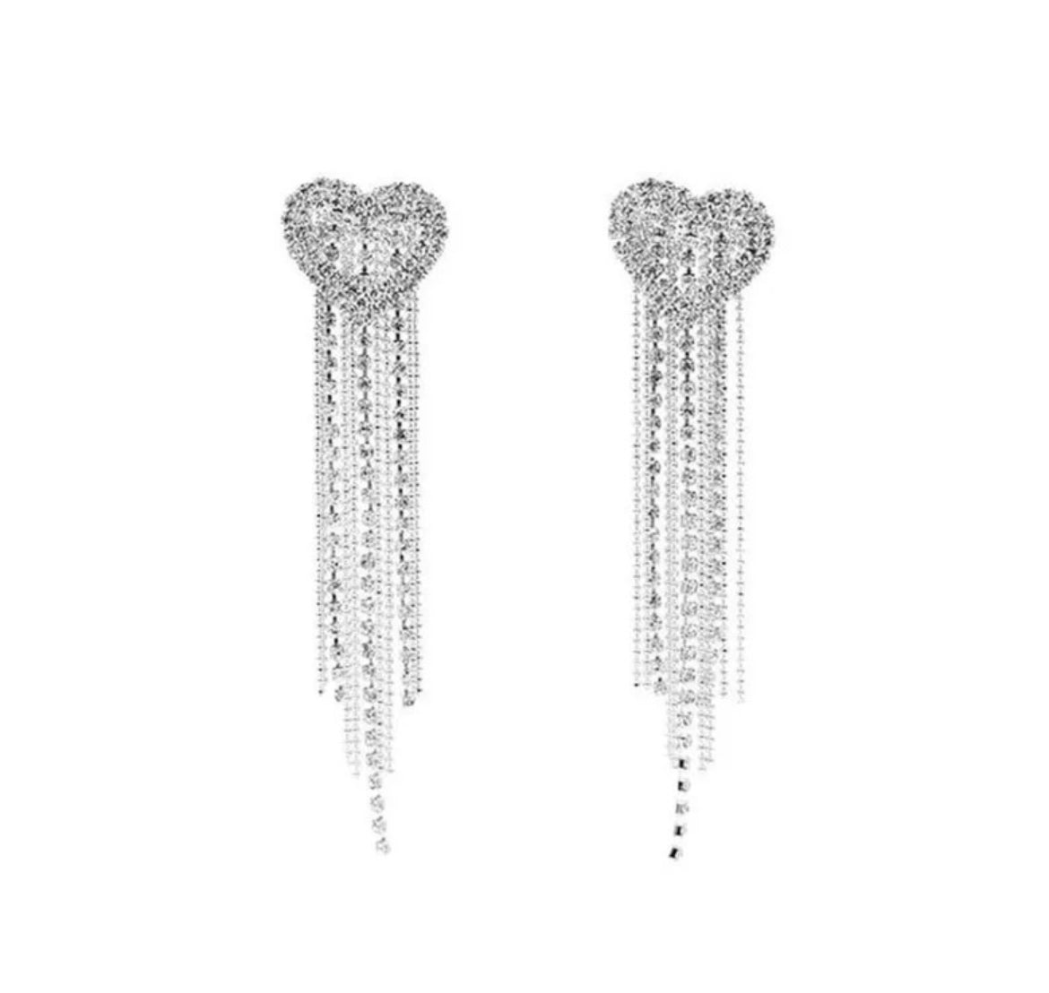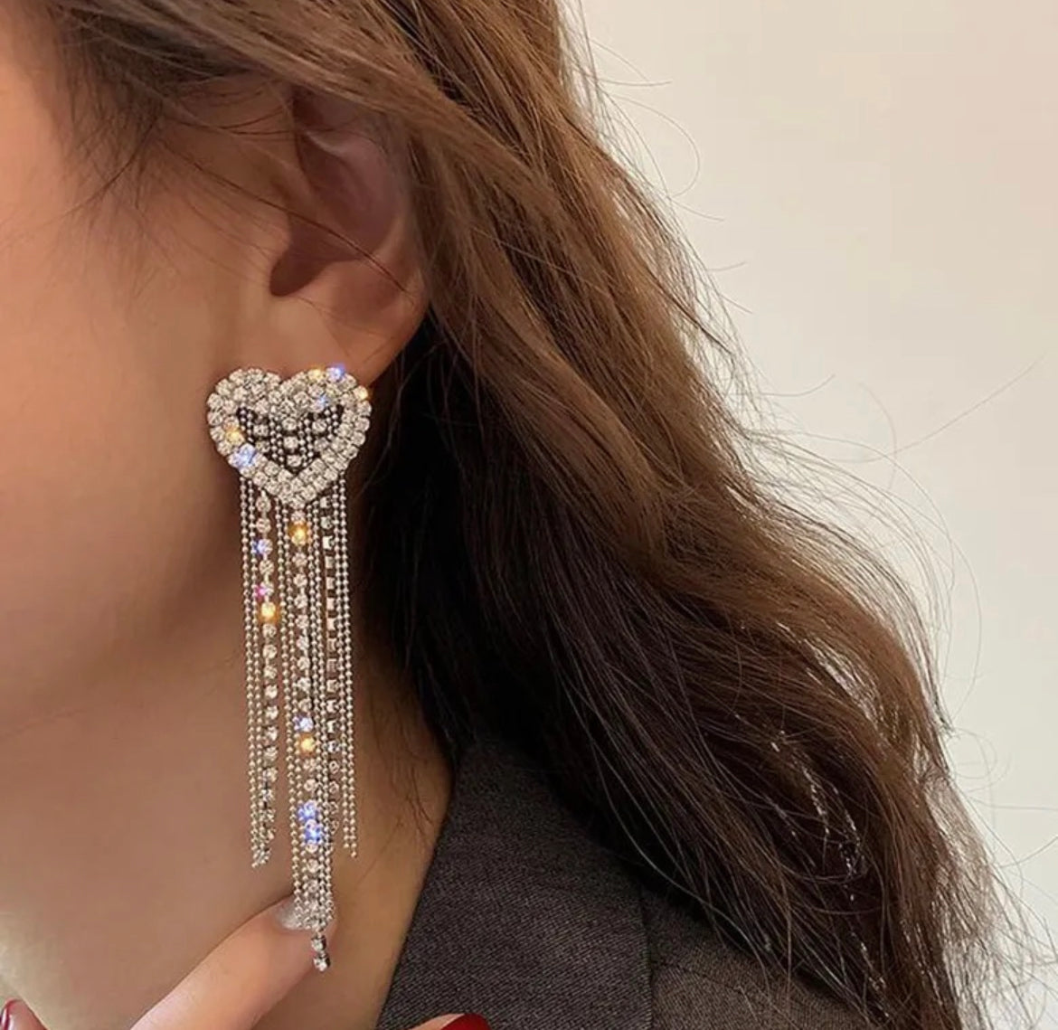 Silver tone metal and rhinestone heart dangle earrings. Post back, light weight. 3” long.