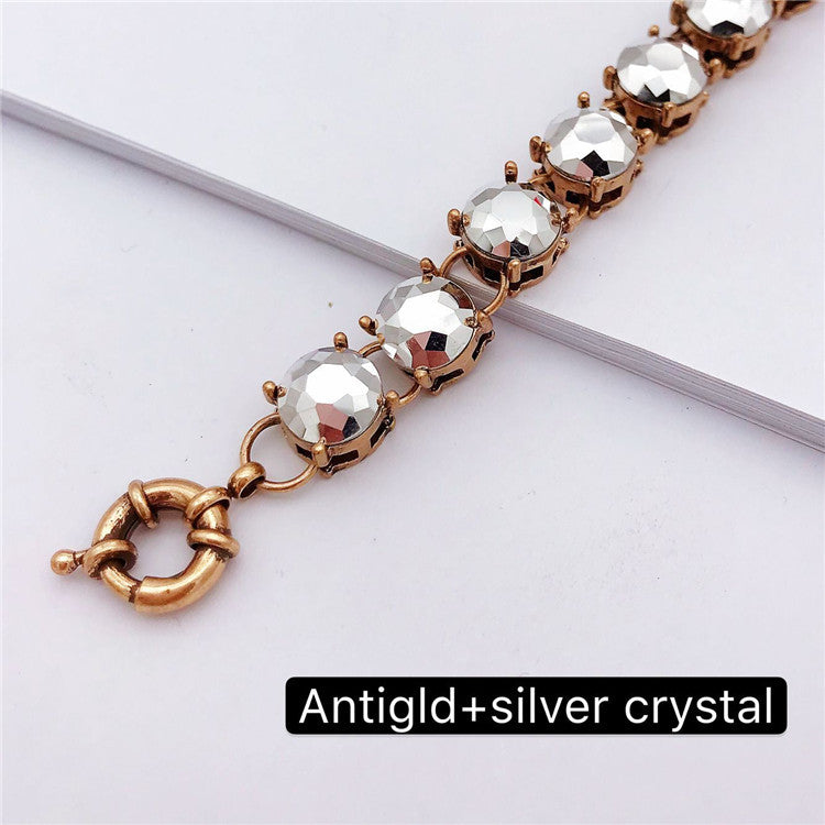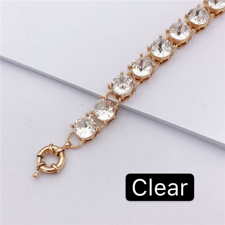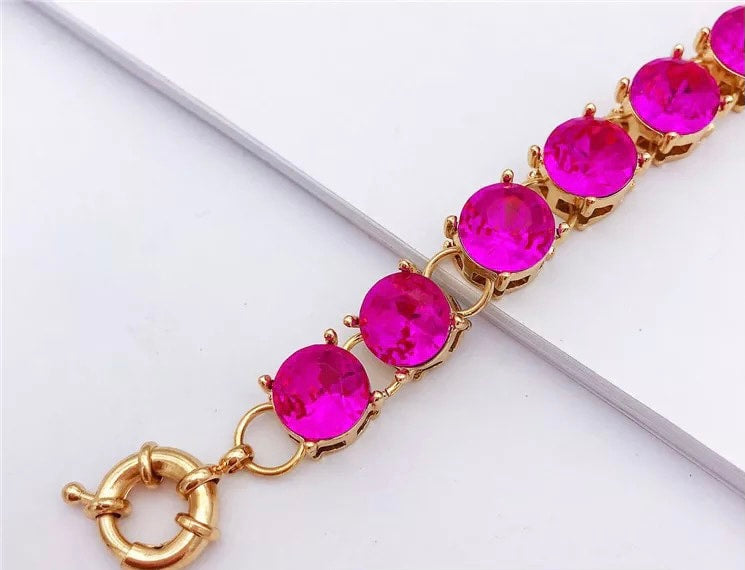 These large rhinestone bracelets will be the arm candy your spring wardrobe needs! Be colorful or subdued. Bright pink, silver or clear rhinestones. Toggle clasp and measures 7.5” long