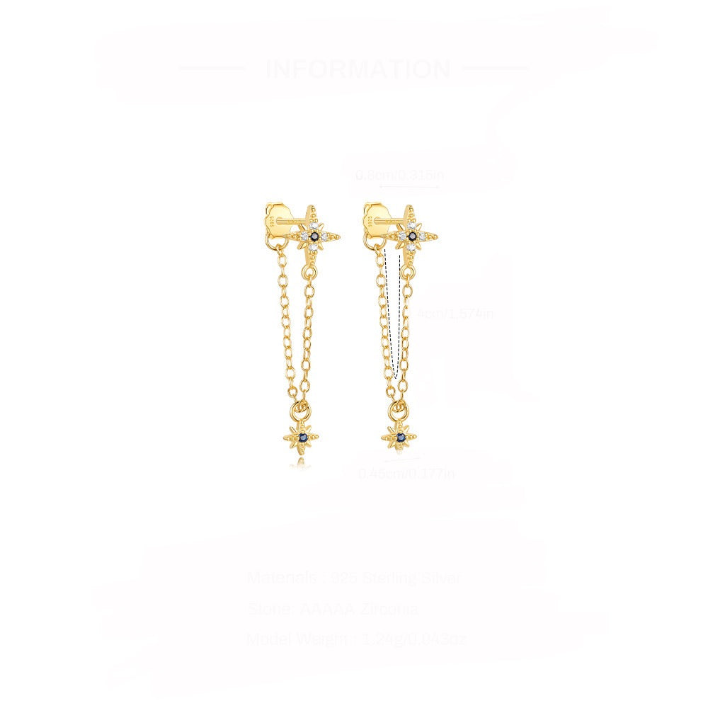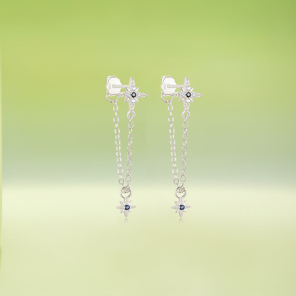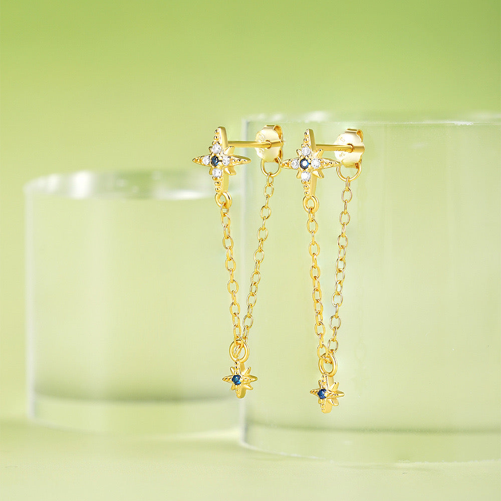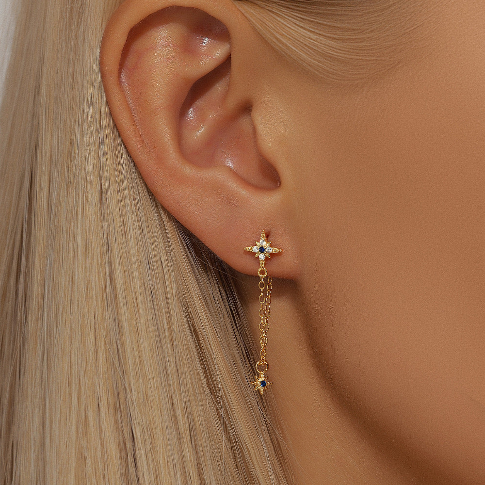 Get ready to blast off into style with the Far Star earrings! These mini stud posts feature a delicate chain dangle that loops around and connects to the back post. A unique and playful addition to any outfit!