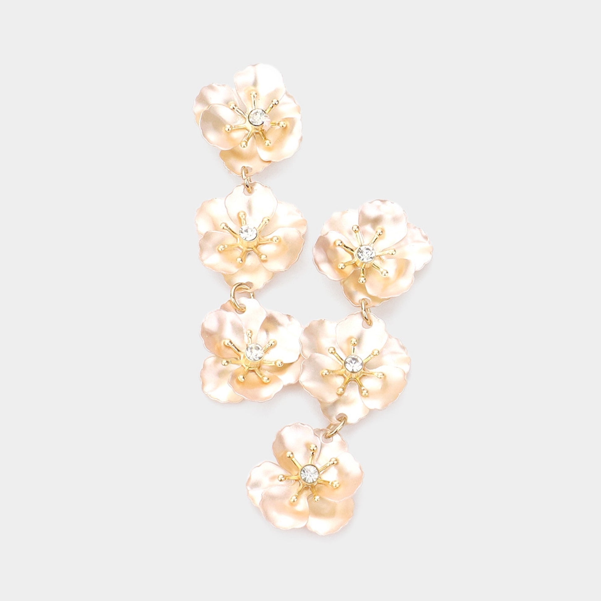These elegant floral drop earrings are a stunning statement piece, featuring cascading blush-toned flowers with delicate gold detailing. Each petal has a soft, satin-like finish, while the center of each bloom is adorned with a sparkling crystal for a touch of radiance. The lightweight design ensures comfortable wear, making them perfect for special occasions or adding a romantic flair to any outfit.