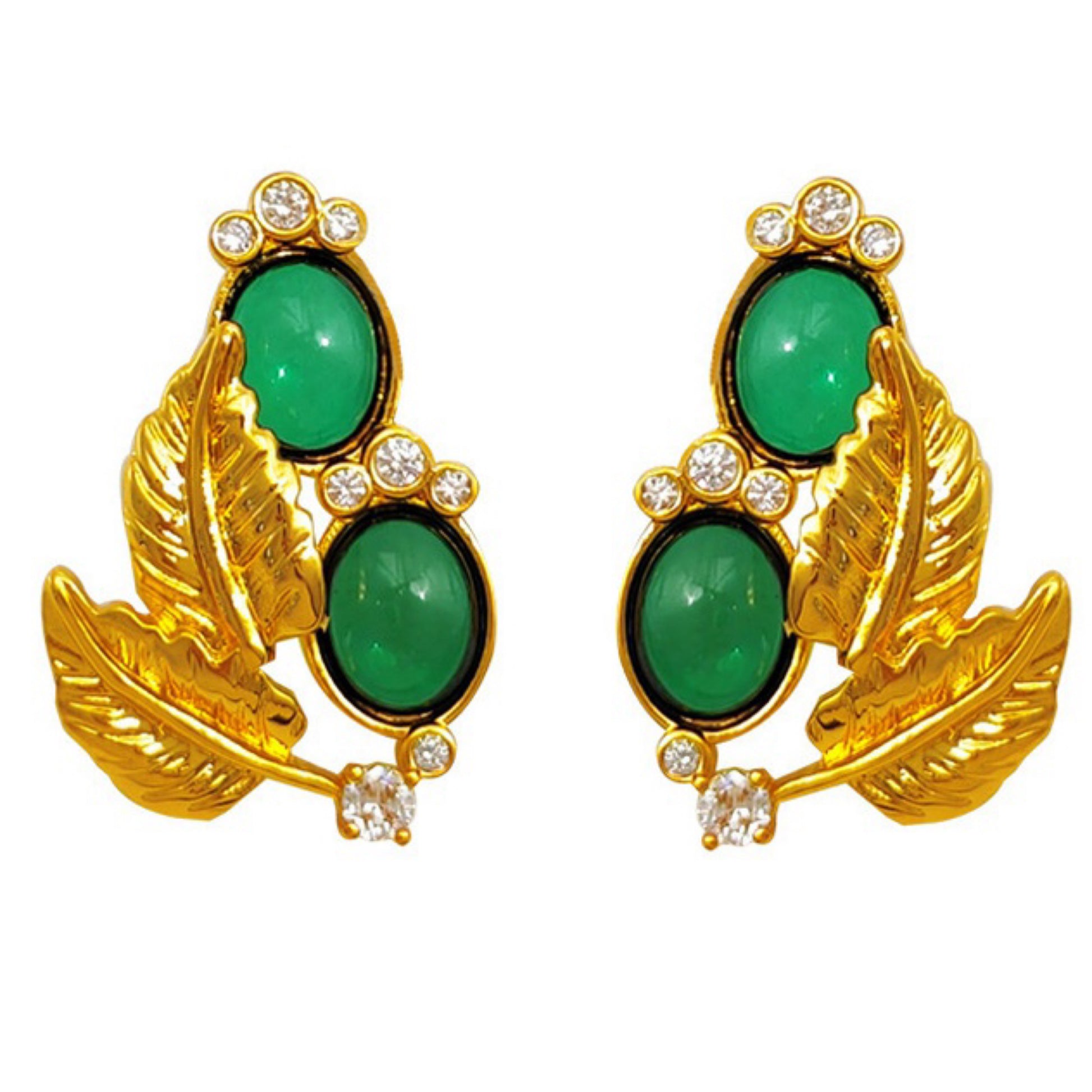 green cabachon statement stud earrings . leaf gold tone metal with bezel set diamonds. measure 1". Post back light weight
