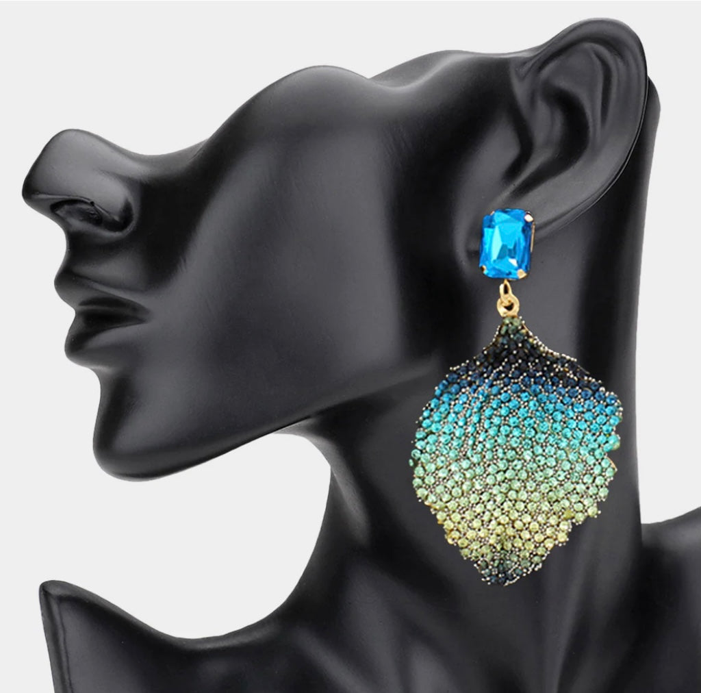 - Blue to Gold Ombre Rhinestone Embellished Fun Fashion Leaf Shaped Earrings | Headshot Earrings