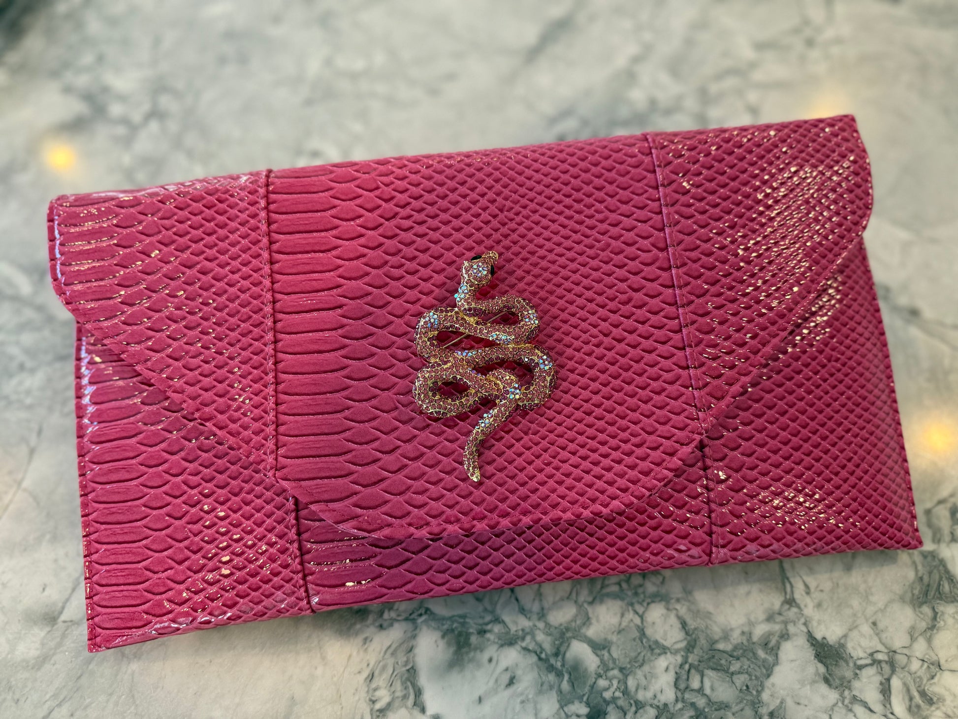 Indulge your unique sense of style with our vegan Leather and Snake envelope clutch/purses adorned with dazzling brooches. Designed with symbolism and significance, these refined and avant-garde adornments exude sophistication and glamour. Elevate your fashion game with these timeless accessories. Versatile and easy to carry with many options!
