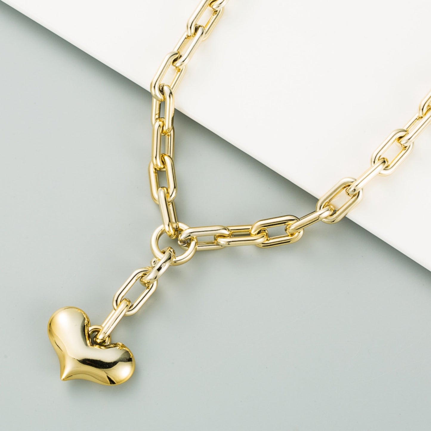 this fun and elegant chunky chain holds a beautiful heart charm lariat for added fun! resin materisal coasted in gold tone for added light weight wear!