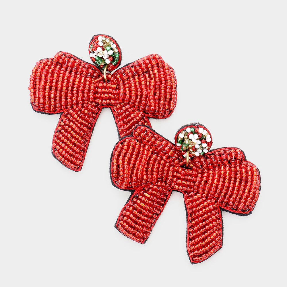 red or green hand beaded seed bead earrings. Post back. Felt back and light weight. Measures 2” wide 2.25” long.