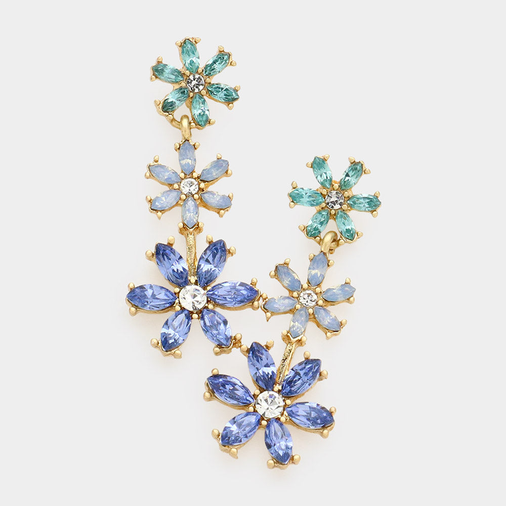 Get ready to dazzle with these Triple Flower Link dangle earrings, featuring ombre rhinestone crystals for a touch of sparkle! Sparkle up your wardrobe with these Triple Flower Link dangle earrings! The ombre rhinestone crystals add a dazzling touch that will make you stand out from the crowd. Don't wait any longer to add some sparkle to your style!