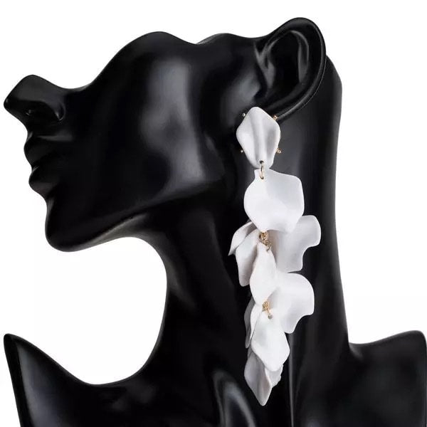These super light weight, white petal dangling earrings hang 4” long with a post back