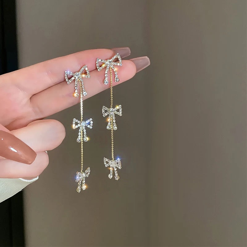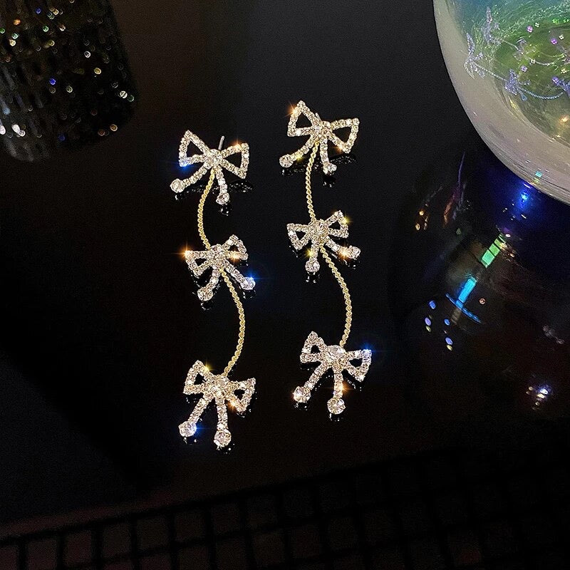 Pave rhinestone 3 bow dangle earrings. 3.5” long post back. Gold tone metal backing. Light weight.